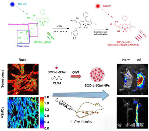 最新的研究成果揭示了衰老细胞,包括血管内皮细胞、平滑肌细胞和巨噬细胞,在动脉粥样硬化形成和发展过程中的关键作用。为了对衰老进行成像,科学家们开发了一种针对衰老相关β-半乳糖苷酶(SA-β-Gal)的成像技术。具体而言,通过将134封装在聚乳酸-羟基乙酸共聚物(PLGA)纳米颗粒的内核中,成功制备了SA-β-Gal传感纳米颗粒(如图64所示)。研究表明,这些纳米探针在动脉中表现出良好的聚集性,进而实现对动脉粥样硬化小鼠体内衰老细胞的高效成像。