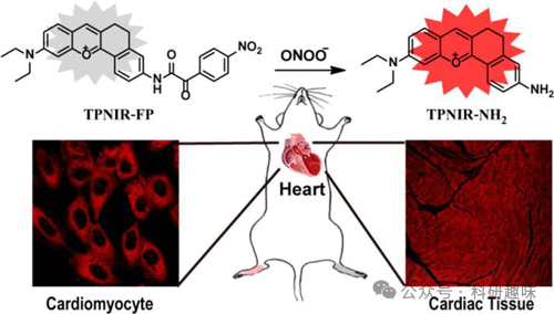 心脏毒性在新药研发及临床应用过程中常构成严峻挑战,以蒽环类抗癌药为例,其高效治疗能力伴随显著的心脏毒性,为临床应用带来极大困扰。为精准评估这一风险,Tang研究团队于2018年成功研发了一种新型TP近红外荧光探针——146号探针,专门用于线粒体中ONOO-(过氧亚硝酸根离子)过度表达的成像检测(如图74所示)。