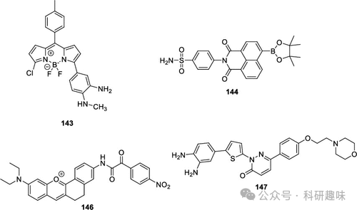在2020年,Xu小组研发了一种新型探针147,专门用于心肌纤维化的成像研究(图 75所示)。这款探针在接触到内源性和外源性NO时,其特有的三嗪基团会迅速发生裂解反应,从而有效抑制了PeT(光诱导电子转移)引起的荧光淬灭现象。此外,由于探针147具备高效的吗啉溶酶体靶向能力,它成功应用于追踪和研究动物组织中NO的产生,特别是溶酶体内一氧化氮的生成情况。