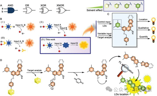 "AND"分子逻辑门正日益受到研究人员的青睐,为通过优化荧光增强(F/F0)以最大化信噪比提供了一种高效策略。以探针132为例,其中脂滴作为可控背景输入,目标分析物作为可变输入。这种双重锁定机制实现了荧光的完全淬灭,从而为目标分析物提供了极高的F/F0比值。同一研究团队进一步利用此原理,对探针进行了重新设计,得到了新型探针133(如图63所示)。遵循相同的反应机理、检测方法和荧光歧管技术,这款改进型探针在受到ONOO-激活并进入液滴后,展现出了惊人的2600倍荧光增强。这一框架为新型高信噪比、显著荧光增强技术的开发提供了一个高效且创新的平台。