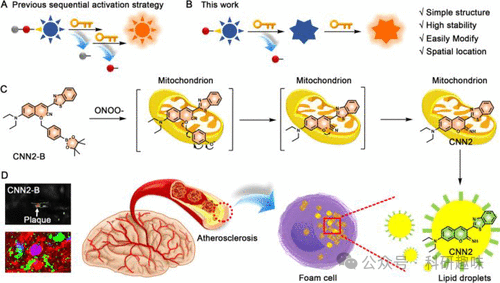 动脉粥样硬化斑块的形成是众多心血管疾病的始作俑者。为了实现对这一病理过程的精准监测和有效干预,近年来,科学家们致力于研发基于活性分子变化的荧光探针技术。这些荧光探针能够特异性地响应动脉粥样硬化过程中的关键分子变化,并通过荧光信号的强弱和变化来反映斑块的生成和发展情况(如图60所示),为动脉粥样硬化的早期诊断和干预提供了新的策略。