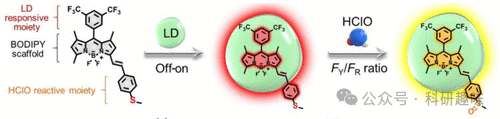 图 66.iSHERLOCK 探针 137 的示意图,用于 LD 和 HClO 的 "关-开 "和比率检测。FY 和 FR 分别代表黄色和红色通道中的荧光强度 (FI)。