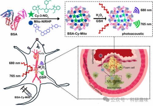 BSA-Cy-Mito纳米探针在氧化低密度脂蛋白激活的巨噬细胞以及高脂饮食导致的载脂蛋白E缺乏小鼠模型中,成功用于GSH/H2O2的检测,从而能够准确诊断与氧化还原相关的炎症过程。通过全身给药,BSA-Cy-Mito纳米探针能够基于不同的氧化还原状态,有效区分易损斑块和稳定斑块。这种高灵敏度的氧化还原反应型光声纳米探针,有望成为早期识别易损斑块的有力工具,为实施成功的预防性治疗策略提供有力支持。