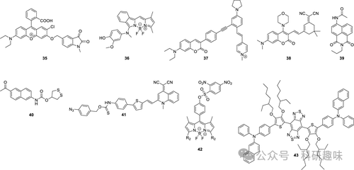 2022年,James等人设计了一种独特的TP比率荧光探针37,用于实时监测氧-葡萄糖剥夺/再氧合(OGD/R)过程中的自噬和氧化应激。ONOO-能够轻易地将炔烃单元氧化为相应的醛,导致分子共轭结构和分子内电荷转移发生显著变化,进而影响其吸收和荧光发射特性。探针37能够对OGD/R过程中的自噬和氧化应激进行实时的比率分析和可视化。研究结果显示,在细胞OGD/R过程中会产生ONOO-,引发细胞氧化应激,并在大约15分钟后出现自噬信号。这一成果为开发新型的中风诊断、治疗和药物设计内聚系统提供了巨大的潜力。
