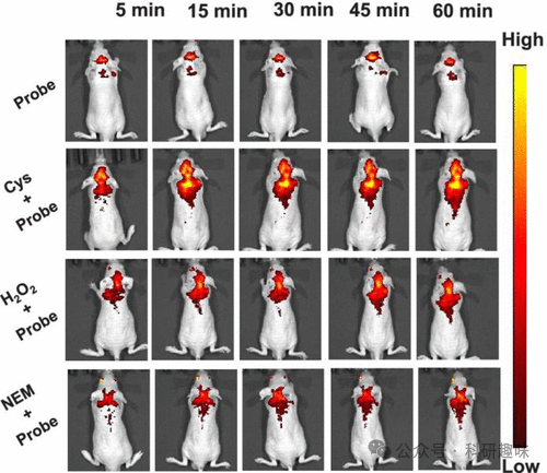 图 5.活体小鼠腹腔注射各种影响 Cys 的制剂后,用探针 8 绘制 5、15、30、45 和 60 分钟的 Cys 通量图。