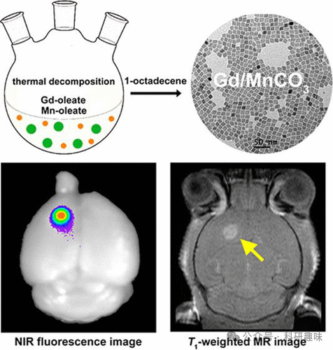 2015年,Ye等人成功报道了1 nm大小的掺钆MnCO₃纳米粒子,这些粒子通过锰油酸酯(探针45)的引导进行热分解处理,实现了对微小脑胶质瘤的精准靶向磁共振(MR)和荧光成像。(101) 在此研究中,研究者们巧妙地在MnCO₃纳米粒子中引入了钆(III)元素,并通过羧酸末端硅烷配体交换和PEG共轭技术,赋予了这些纳米粒子出色的水分散性和水稳定性。