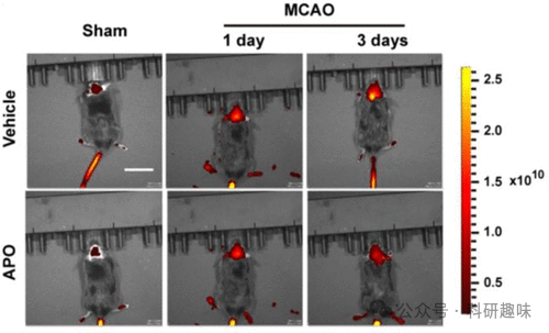图 16.在大脑中动脉闭塞(MCAO)过程中,使用探针 38 在不同时间段对不同处理方法下的大脑自噬进行活体成像:Sham 组(未进行 MCAO 的小鼠)、MCAO 组(进行 MCAO 的小鼠)、载体组(向小鼠尾静脉注射生理盐水)和 APO 组(向小鼠腹腔注射阿朴霉素)。