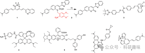 同样值得关注的是,Wang等人在2022年开发的探针2。该探针采用“光触发”荧光机制,能够检测Aβ聚集。在光照条件下,探针2中的6-硝基藜芦酰保护基团发生光裂解,导致酚基环化至邻近的酯上,进而产生荧光香豆素核心。这一新形成的荧光团虽荧光较弱,但结合Aβ后能产生强烈的局部荧光反应。实验证实,探针2在APP/PS1转基因AD模型小鼠体内能有效检测Aβ聚集,且光照后血脑屏障(BBB)通透性良好。这种创新的“光触发”方法为设计高信噪比、靶向特定蛋白质的荧光探针提供了新的思路。