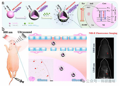 图 22.(a) 水溶性染料敏化核壳 NaNdF4@NaLuF4/IR-808@DSPE-PEG5000 NPs(探针 54)的合成及其能量传递机制示意图。(b) 这些核壳 NPs 在超声波介导的 BBB 开放情况下应用于正位胶质母细胞瘤的近红外-II 荧光成像,并在送入大脑后对脑组织进行稀土染色。