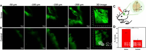 图 9.用探针 15 对应激小鼠(A,连续 14 天的慢性束缚应激)和对照组小鼠(B)大脑进行原位 TP 荧光成像。(C)三种不同的 TP 荧光成像区域示意图。(D)A 和 B 中小鼠的相对荧光强度:480-650 纳米。标尺 = 50 μm。