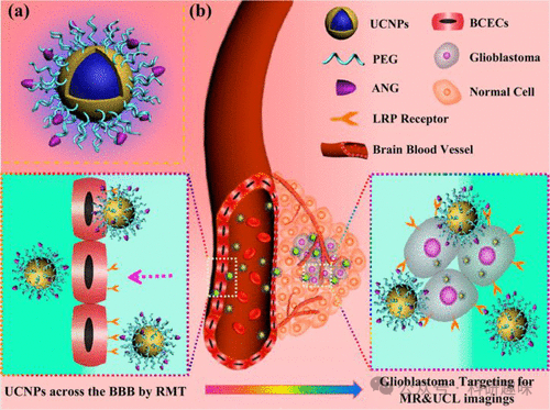 图 17.(a) 双靶向探针 44 的设计。(b) 双靶向系统探针 44 的示意图,通过 LRP 介导的内吞作用穿过 BBB 并靶向胶质母细胞瘤,实现颅内胶质母细胞瘤的 MR 和 UCL 成像。