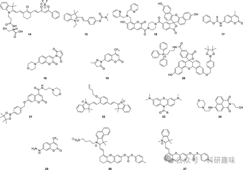 为了进一步研究抑郁症中Cys的变化,Ma等人在2022年提出了一种新的荧光探针18,专门用于监测Cys水平。该探针以香豆素为荧光团,马来酰亚胺基团作为Cys的特异性识别基团。在未与Cys结合时,荧光团与马来酰亚胺基团之间的PeT效应抑制了荧光发射。而当Cys的硫醇基团与马来酰亚胺发生加成反应后,PeT效应减弱,探针的荧光特性得以恢复。Ma及其合作者观察到Cys水平与抑郁程度之间的负相关关系,这一发现与探针17的研究结果相呼应。这两项互补性研究不仅展示了设计此类探针的通用原则,还突出了其在研究神经疾病中生物巯基(尤其是Cys与抑郁症关系)方面的潜力。