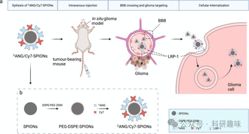 在2014年的研究中,Xu等人成功合成了纳米荧光探针AsT(探针53)。他们将肽TGN与AS1411结合,用于靶向血脑屏障(BBB)递送。AS1411是一种富含鸟嘌呤的适配体,通过与胶质瘤中过表达的核素蛋白相互作用,引导纳米粒子导向胶质瘤细胞。TGN和AS1411通过PEG连接器巧妙耦合,而在AS1411的末端,研究人员添加了3号氰基荧光标签,以便追踪AsT纳米探针的动向。体外细胞摄取实验和胶质瘤球体摄取实验均显示,探针53能够被胶质瘤和内皮细胞有效摄取,并具备穿透内皮细胞单层及被胶质瘤球体摄取的能力。进一步的体内实验进一步证实了探针53能够高效且高强度地靶向胶质瘤。