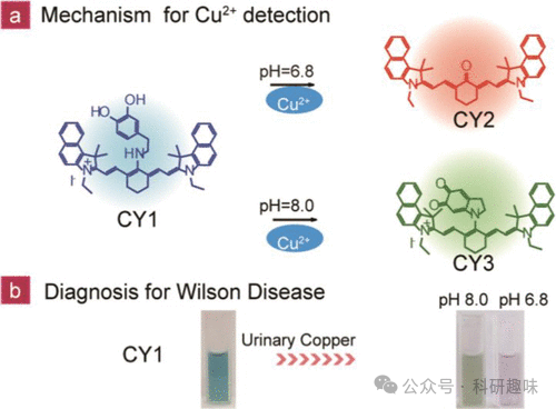 图 6. (a) CY1  在酸性和碱性溶液中被 Cu2+ 氧化成 CY2/CY3。(b) 在 WD 患者的尿液中使用 CY1 作为铜离子检测探针,在检测到 Cu2+ 时会显示由蓝色变为绿色(碱性)或粉红色(酸性)。