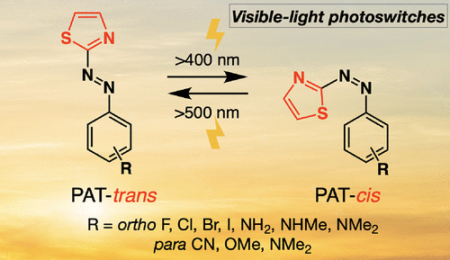 作者展示了一类新型的五元“杂环芳基偶氮”光开关,可在可见光照射时发生可逆异构化。直接连接苯基偶氮色团的噻唑光开关与传统偶氮苯和其他杂环芳基偶氮化合物的光谱特性非常不同,这些化合物能够使用可见光(405和525 nm)照射可逆地进行异构化,通过在苯环上引入邻位和对位取代基,可以进一步调节PAT的光开关性质(λmax,t1/2和PSS比率)。特别是,具有邻位NH2取代基的化合物在可见光(525和625 nm)辐照下表现出可逆的光异构化,具有比可见光可切换偶氮苯更小的热稳定性补偿效应和更长的半衰期。此外,PAT光开关在还原剂存在下表现出极佳的稳定性。