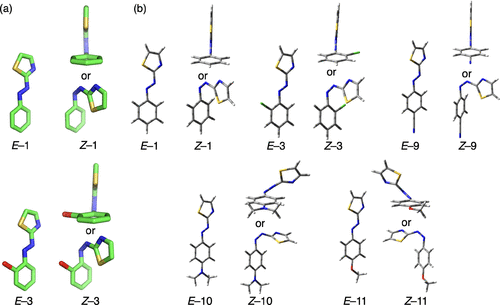 图3. (a) 1和3的E和Z异构体的单晶X射线结构(绿色=C;蓝色=N;金色=S;红色=Cl)。为了清晰起见,氢原子被省略了。(b) E和Z异构体的1,3,9,10和11的几何优化计算构象。