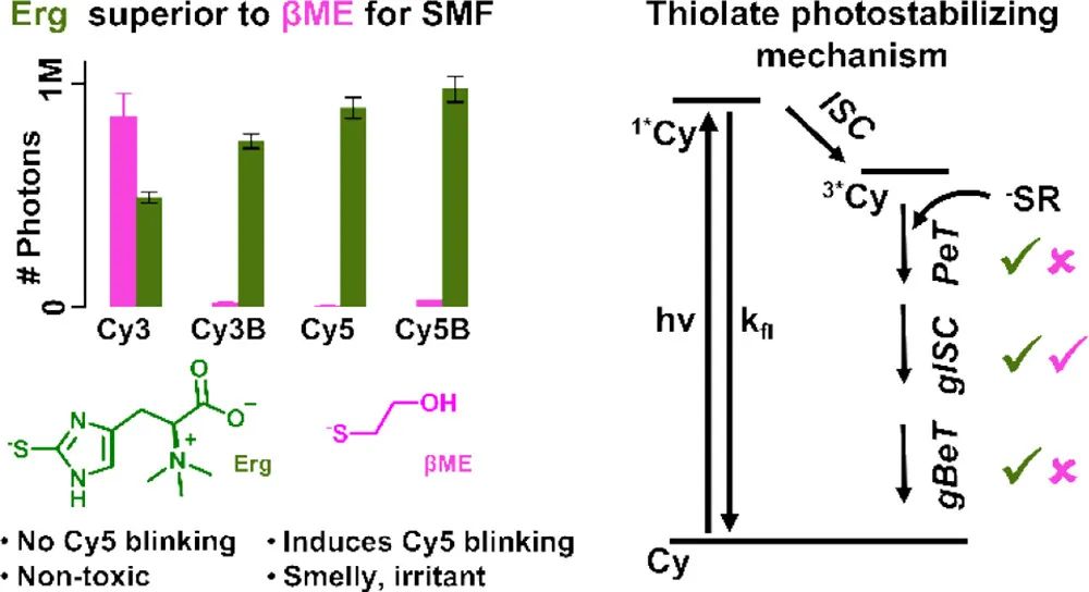 本研究的单分子荧光成像结果显示,天然氨基酸麦角硫因可显著提高Cy3、Cy3B、Cy5和Cy5B的光稳定性,相比常用的烷基硫醇β-ME,其荧光光子产量提高了1-2个数量级。与Trolox相比,麦角硫因对所有四种荧光染料的效果也有改善。大量的激光诱导光解实验研究了机制,证明硫代咪唑抗氧化剂麦角硫因是一种生物相容的解决方案,可光稳定最常用的氰基荧光染料,满足荧光成像的要求。