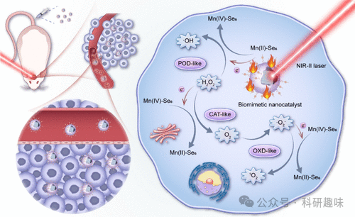 总之,得益于稳定的抗氧化结构,产生 ROS 的酶促机制可归纳如下:从吸收 H2O2 开始,类 POD 和 Fenton 过程协同产生剧毒的-OH,从而杀死癌细胞。同时,类 CAT 和类 OXD 级联过程将吸收的 H2O2 分子转化为 O2,再转化为 -O2。这一过程中产生的-O2是另一种用于对付肿瘤的剧毒 ROS。生成 ROS 的整个级联循环需要额外的能量来克服限速步骤中的障碍,而 NIR-II 照射可作为智能开关,通过光热转换诱导更高的温度。