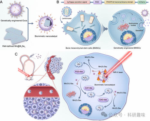 胶质母细胞瘤(GBM)因其高度侵袭性而难以治疗,同时药物通过血脑屏障(BBB)的能力受限,这进一步加大了治疗的难度。为了解决这一难题,作者提出了一种创新的生物仿生策略,即开发一种名为Mn@Bi2Se3@RGE-Exos的基因工程外泌体纳米催化剂。这种纳米催化剂能够显著提高药物穿透BBB的能力,并通过其类酶催化活性,实现对GBM的高效治疗。值得注意的是,该纳米系统展现出可光热激活的多种类酶反应活性。在NIR-II光的照射下,Mn@Bi2Se3@RGE-Exos能催化过氧化氢转化为羟自由基、氧及超氧自由基,形成过氧化物酶(POD)、氧化酶(OXD)和过氧化氢酶(CAT)型的纳米催化级联反应。这种反应能引发强烈的氧化应激,进而对GBM细胞造成损伤。通过体外、体内实验以及蛋白质组学的深入分析,作者发现Mn@Bi2Se3@RGE-Exos不仅能破坏细胞稳态,还能增强免疫反应并诱导癌细胞发生铁死亡,在保持良好生物安全性的同时对GBM具有显著的抗癌效果。总体而言,本研究的成功为刺激响应型纳米催化药物的设计和临床研究提供了有效的策略,为治疗GBM等难治性脑癌开辟了新的途径。
