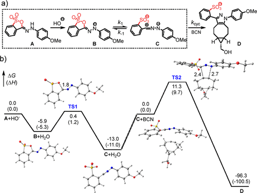图2. (a) HS到NI同构化(方框)和1,3-环化的反应步骤图。(b) 反应图涉的自由能曲线。A,中性的磺酸钠形式;B,A的阴离子形式;TS1,磺酸钠环破裂的过渡状态;C,腈亚胺形式;C+BCN,C和BCN之间的反应物复合物;TS2,环装化的过渡状态;D,环装产物。