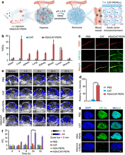 图 2. HSA/CAT-PEPA 纳米微胞可有效积聚并穿透肿瘤组织,逆转肿瘤缺氧