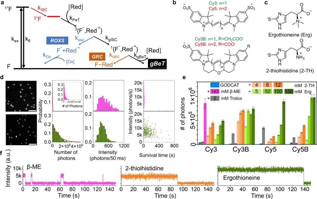 本研究的单分子荧光成像结果显示,天然氨基酸麦角硫因可显著提高Cy3、Cy3B、Cy5和Cy5B的光稳定性,相比常用的烷基硫醇β-ME,其荧光光子产量提高了1-2个数量级。与Trolox相比,麦角硫因对所有四种荧光染料的效果也有改善。大量的激光诱导光解实验研究了机制,证明硫代咪唑抗氧化剂麦角硫因是一种生物相容的解决方案,可光稳定最常用的氰基荧光染料,满足荧光成像的要求。