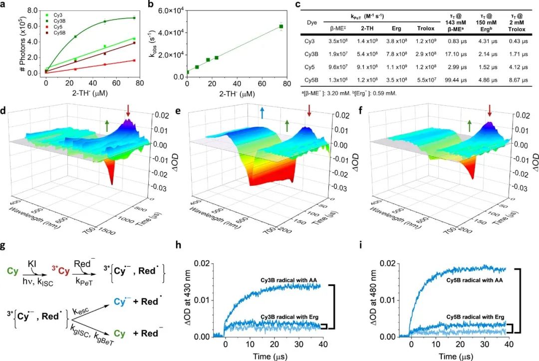 最后,为监测自旋禁阻跃迁与自由基逸出之间的竞争情况,我们估算了自由基逸出的百分数。在AA条件下出现新的长寿命氰基吸收带表示自由基逸出,同时基态恢复缓慢。而在2-TH条件下四种染料均未见此吸收,自由基逸出可忽略。此外,AA条件下基态漂白呈双指数衰减,其中短寿命部分对应自旋轨道耦合后自由基再结合,长寿命部分对应自由基转化为阴离子。因此,2-TH可有效抑制自由基逸出,促进自旋禁阻跃迁。 图 2.通过纳秒 LFP 进行的集合机理研究。(a) 通过单分子分析得出的青色染料的平均光子数与 2-TH 浓度(硫醇形式)的关系。除 Cy3B 外,其他所有染料的线性拟合均以直线表示。(b) Cy3B 受激三重态衰变速率常数(kobs)与 2-TH 硫代硫酸盐浓度的关系。(c) β-ME(‡ 报告于参考文献 (23))、2-TH、麦角硫因或 Trolox 对四种氰基染料研究得出的 kPeT 值,以及在任一淬灭剂的最大实验浓度下的估计三重态寿命。硫醇基淬灭剂的活性形式(硫酸盐)是通过计算得到的。(d-f)Cy3B 的瞬时吸收(ΔOD)光谱,从左到右依次为无三重猝灭剂、AA [0.19 mM] 和 2-TH [12 mM]。蓝色(430 nm)、绿色(550 nm)和酒红色(630 nm)箭头分别表示氰基吸收、基态漂白和激发的三重态吸收区域。无三重态淬灭剂的 Cy3B 的三重态吸收在 ∼1 毫秒和初始衰减后明显增加(e 面板),这是在本实验中长时间探查监测光束不稳定性的结果。(g) PeT 与氰基染料激发的三重态、自由基逸出(伴随吸收)与二价 ISC 和 BeT(无吸收)的反应方案。(h) AA [1.71 mM] 或麦角硫因 [100 mM] PeT 到 Cy3B 激发三重态时形成的 Cy3B 自由基增长的瞬态吸收时间轨迹。图中还显示了没有淬灭剂时的瞬态吸收带(浅蓝色),说明直接激发时存在残余吸收。(i) 在 AA [11.74 mM]、麦角硫因[100 mM]和无三重淬灭剂(浅蓝色)的情况下,显示了 Cy5B 的相应瞬态吸收时间轨迹。