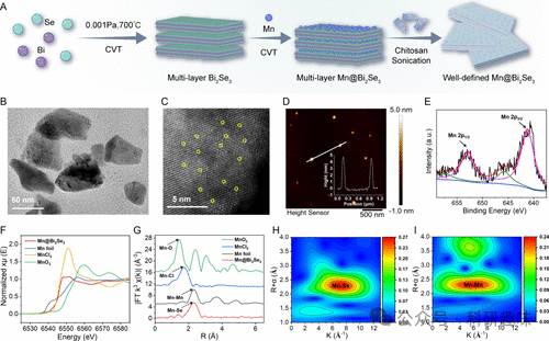 为了深入了解Mn@Bi2Se3纳米体系中锰的氧化态,作者进行了X射线吸收近边缘结构(XANES)光谱分析,并与不同氧化态的锰参考化合物(如MnCl2和MnO2)进行了对比(图1F)。结果显示,Mn@Bi2Se3纳米系统中Mn的主要氧化态为+2,与XPS结果相符。此外,通过X射线延展边吸收精细结构(EXAFS)方法,作者全面分析了Mn的局部配位环境。Mn@Bi2Se3纳米系统在R空间的傅立叶变换EXAFS曲线显示出与Mn-Se键相对应的显著峰值(图1G及图 4),且未观察到与Mn-Mn键相关的特征峰。Mn-Se键长度测定为2.66 Å,与先前关于Mn-Se键的研究结果一致。(36) 小波变换(WT)分析进一步证实,Mn@Bi2Se3的最大值归因于Mn-Se配位(图1H),与锰箔和其他样品显著不同(图1I和S10)。这些发现强有力地证明了Mn@Bi2Se3纳米系统中不存在Mn-Mn键,进一步确认了锰原子的原子级分散状态。