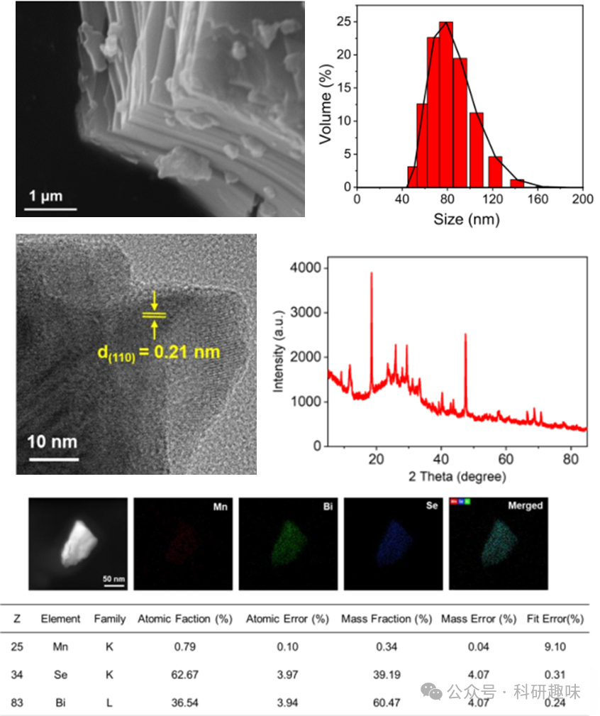 图 2. 多层Mn@Bi2Se3 的扫描电镜图、粒径分布、高分辨率投射电镜图、XRD 图及 STEM-DF 元素分析