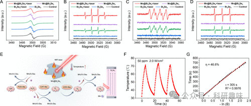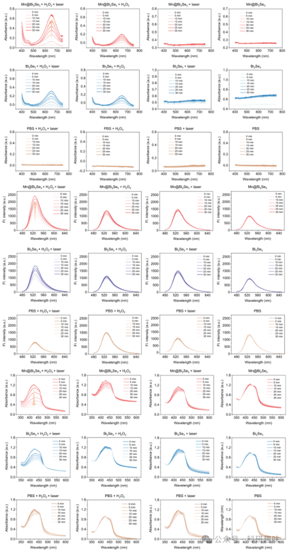 鉴于光敏化反应(即光动力过程)亦能产生ROS,作者利用一系列ROS探针(包括TMB、DHR123和DPBF等)进行了深入研究,以探究ROS形成的确切机制。如图 7 所示,即使在近红外-II光照射下,若不添加H2O2启动多重酶模拟级联反应,ROS的产生亦微不足道。这一发现排除了Mn@Bi2Se3和Bi2Se3通过光动力过程产生ROS的可能性,并暗示近红外-II光在激活上述酶模拟活性中扮演了关键角色。