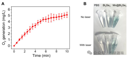作者利用电子自旋共振(ESR)光谱技术,深入研究了Mn@Bi2Se3的酶模拟催化活性。与先前报道的纳米催化剂(如纳米酶)直接产生ROS的特性不同,Mn@Bi2Se3在常态下表现出极低的酶模拟催化活性,这一惰性特性与纯Bi2Se3 一样(图 5A-D)。然而,令人惊奇的是,当置于近红外-II光(1064 nm,1.0 W/cm²,5分钟)照射下时,Mn@Bi2Se3展现出相较于Bi2Se3更为显著的H2O2消耗能力(图 5A),并伴以大量的羟基自由基(图2B)。在相同条件下,Mn@Bi2Se3亦展现出类OXD活性,有效产生-O2-(图2C)。尤为值得关注的是,Mn@Bi2Se3的-O2-生成量远高于Bi2Se3,这归因于其在类CAT反应中通过催化H2O2产生了更多的O2,这一点通过溶液中形成的气泡得到了直观验证(图 6)。此外,作者还观察到Mn@Bi2Se3和Bi2Se3在多酶模拟催化条件下均能生成单线态氧(1O2)(图 5D)。