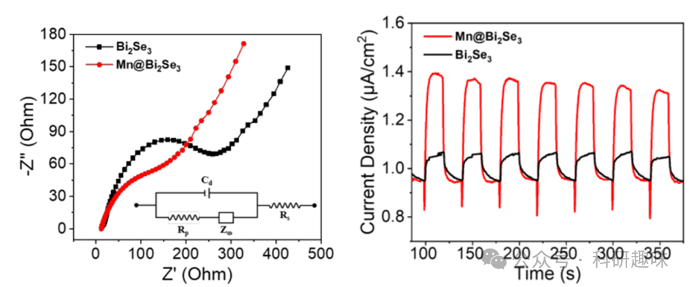 图 9. Bi2Se3 and Mn@Bi2Se3 的 EIS 图谱和光电流响应图谱