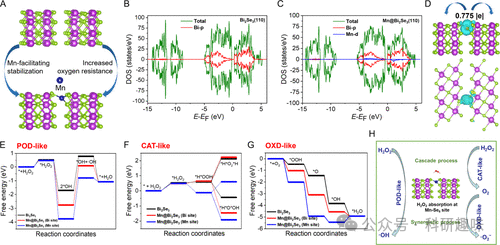 作者对材料体系进行了密度泛函理论(DFT)计算,以深入探讨 ROS 生成的过程,并了解金属-底物相互作用如何赋予锰单原子相对于 Bi2Se3 的催化优势。根据 EXAFS 分析拟合的配位结果,首先通过将 Mn2+ 阳离子锚定在 Bi2Se3 纳米片的(110)平面上优化了 Mn-Se6 配位位点。如图 10A 和图 11 所示,Mn 阳离子的加入极大地改变了 Bi2Se3 的电子特性和稳定性,Se 空位能从 3.59 eV 猛增到 5.30 eV 就证明了这一点。这表明,由于锰的修饰作用,成功地制备出了具有潜在抗氧化性和耐水腐蚀性的稳定纳米平台,支持了基于该 Mn@Bi2Se3(110) 模型计算的可靠性。