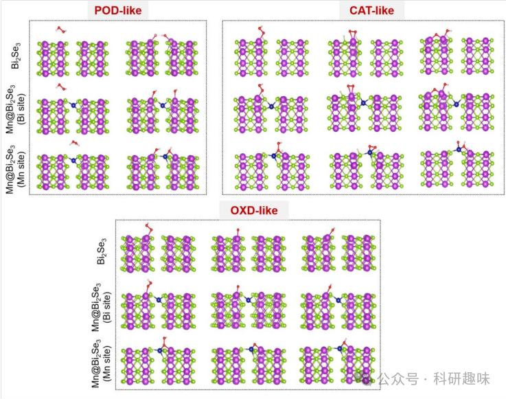 值得注意的是,在作者的实验中,没有激光照射就检测不到 ROS(参见图 7);这与 Mn@Bi2Se3 在吸收 H2O2 时所面临的障碍一致。然而,Bi2Se3 的在近红外-II 激光照射后产生高温,有助于克服这一障碍,在肿瘤微环境(TME)中产生大量 ROS,从而杀死肿瘤细胞。与此同时,利用 H2O2 作为起始材料的级联催化过程也得到了证实。对三个位点的 CAT 类过程的模拟表明,锰的加入在断开吸收的 H2O2 分子的 H-O 键方面发挥了关键作用(图 10F)。铋位点需要克服 0.16 eV 的能量势垒,而这一过程是自发发生的,锰位点的能量急剧下降(0.61 eV)。此外,Bi2Se3(110) 和 Mn@Bi2Se3(110)的 Mn 位点(0.70 eV)产生 O2 的能垒(1.53 eV)比 Bi 位点(1.58 eV)低得多,这与没有检测到 O2 分子的实验数据一致。Bi2Se3 的光热效应提供的额外能量有助于克服这一较低的障碍,在近红外-II 激光照射下有效地产生 O2,为 OXD 过程提供能量。图 10G 展示了上述三种模型的类 OXD 过程的路径,它将分子 O2 转化为 -O2-,从而破坏肿瘤细胞内的大生物分子。Mn@Bi2Se3(110)(Mn 位点)表现出对 O2 的强烈吸收,最低吸收能为 -2.01 eV,而 Bi2Se3(110) 和 Mn@Bi2Se3(110)(Bi 位点)的吸收能分别为 -0.48 和 -1.04 eV。这说明锰物种在这一类似 OXD 的过程中起了作用,锰与 O2 的配位产生了较长的 O-O 键长度,使其更容易断裂以进一步转化。图 S22 列出了三种模型吸收的关键中间产物的构型。