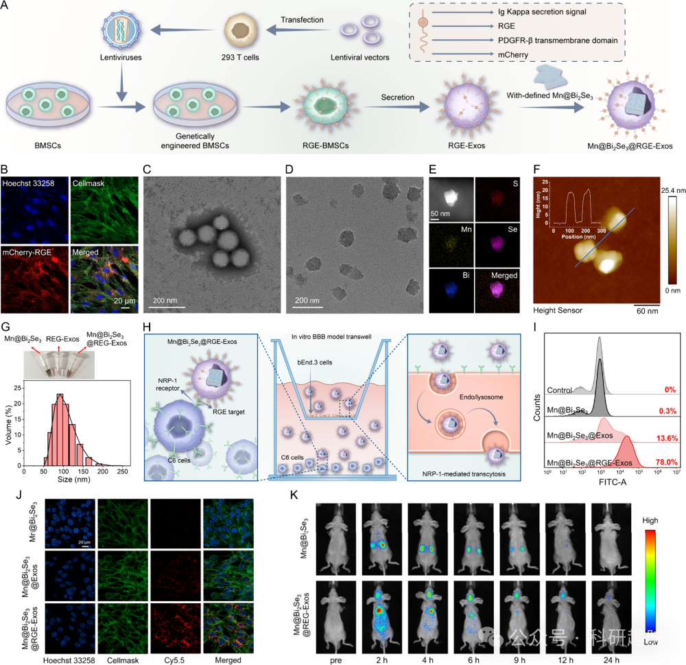鉴于Mn@Bi2Se3纳米系统在NIR-II光照下展现出类似酶的催化活性,但其穿越血脑屏障(BBB)的能力受限且靶向特异性不足,作者实施了一种生物仿生策略,通过RGE肽修饰基因工程外泌体,并成功将其与纳米催化剂表面结合,显著提升了Mn@Bi2Se3穿越BBB及特异性靶向脑癌细胞的能力。