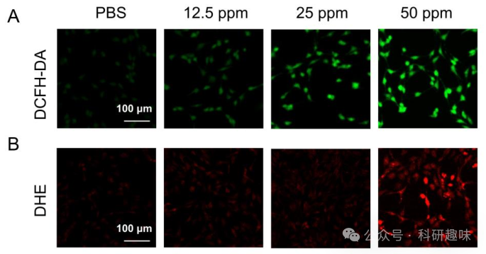 为了验证这一机制,作者利用特定的荧光探针——二氢乙锭(DHE)和2′,7′-二氯二氢荧光素二乙酸酯(DCFH-DA)——对Mn@Bi2Se3@RGE-Exos在近红外-II光照射下产生的ROS进行了量化分析。正如预期,Mn@Bi2Se3@RGE-Exos处理的C6细胞在NIR-II光照射(1064纳米,1.0瓦/平方厘米,5分钟)下,其ROS的产生呈现剂量依赖性增加,明确证实了Mn@Bi2Se3@RGE-Exos在细胞内部诱导ROS生成的能力(图 16)。