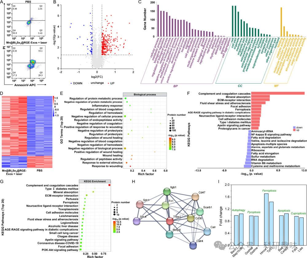 为了深入理解Mn@Bi2Se3@RGE-Exos与激光联合治疗对C6细胞的作用机制,研究团队运用串联质量标记(TMT)技术,对处理与未处理的C6细胞进行了蛋白质组学的详尽定量分析。图 17B揭示了7633个鉴定蛋白质中,共有307个差异表达蛋白(p < 0.05),其中256个上调,51个下调。图 17D展示了组内与组间的高度一致性。根据基因本体论(GO)分类,这些差异蛋白被划分为生物过程(BP)、分子功能(MF)和细胞成分(CC)三类(图 17C),并对每类中前20个进行了深入研究。