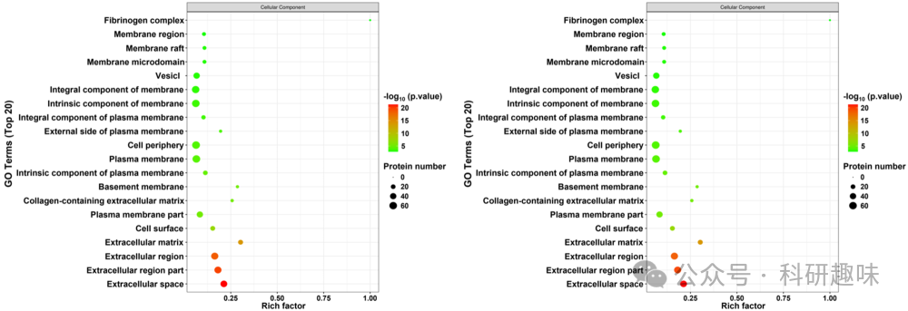 在BP富集分析中,差异蛋白显著富集于伤口愈合反应、肽酶活性调节等生物过程中,暗示细胞生命系统的平衡状态受到了显著干扰(图 17E)。在CC类别中,尤其是与细胞外基质相关的蛋白质,显示出了显著的变化(图 18)。而在MF类别中,差异蛋白的活性受到硫化合物结合、肝素结合和糖胺聚糖结合等多种因素的调控,揭示了这些效应背后的特定分子相互作用(图 18)。