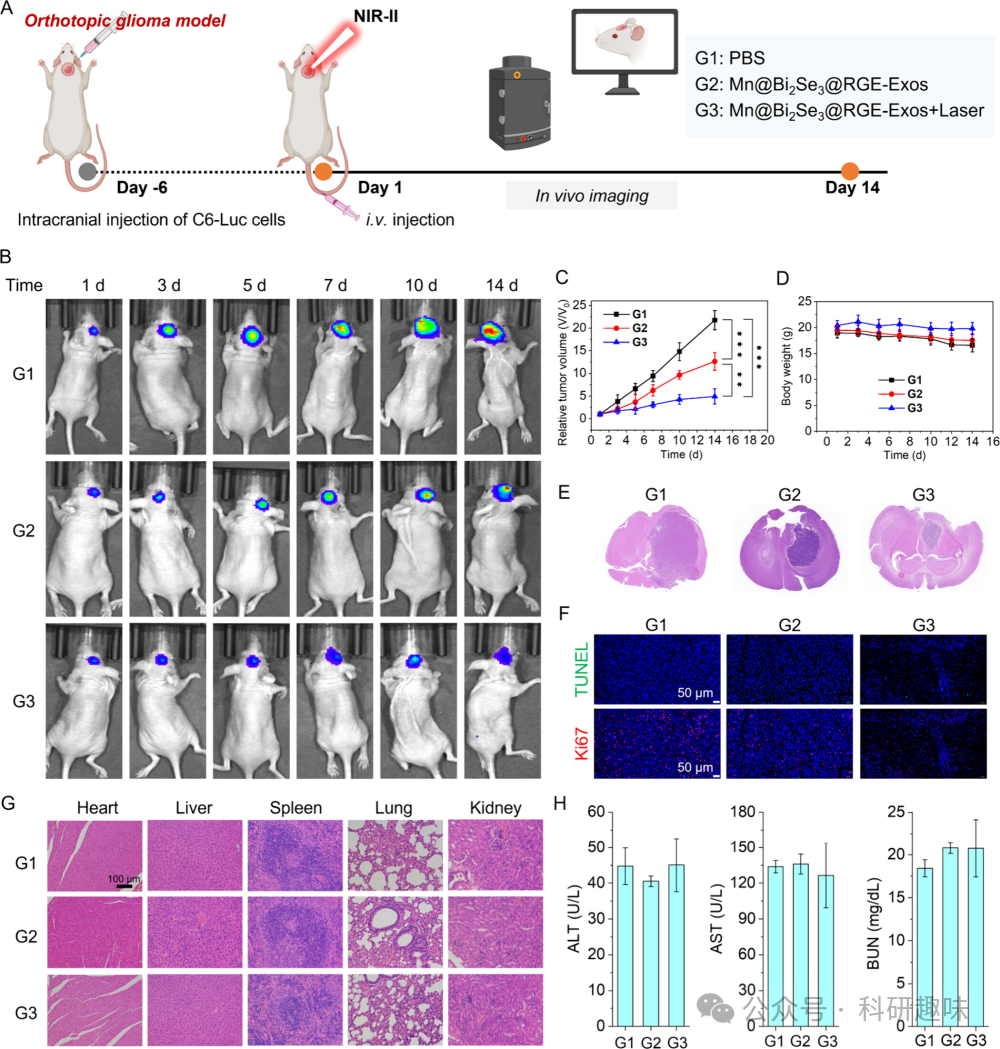 受到生物仿生纳米催化剂在体外展现出的显著抗癌活性的鼓舞,作者进一步利用携带C6胶质瘤细胞的裸鼠模型评估了其体内的抗肿瘤效果(图 21A)。实验动物被随机分为三组:对照组G1(PBS处理)、实验组G2(Mn@Bi2Se3@RGE-Exos处理)和联合治疗组G3(Mn@Bi2Se3@RGE-Exos + 近红外-II激光照射)。
