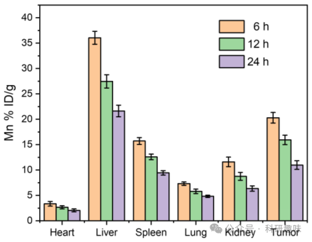 此外,通过ICP-MS分析,作者评估了静脉注射Mn@Bi2Se3@RGE-Exos后锰在肿瘤小鼠主要器官和肿瘤中的生物分布。结果显示,注射后6小时肿瘤中锰的相对分布量达到20.30%,高于12小时和24小时的时间点(分别为15.94%和10.99%)(图 23),这表明Mn@Bi2Se3@RGE-Exos具有良好的肿瘤蓄积能力,这归因于基因工程外泌体促进的血脑屏障(BBB)穿越和对胶质瘤细胞的特异性靶向。主要器官的组织学分析(H&E染色)显示,各种治疗干预后均未出现显著的病理变化(图 21G)。同时,血液生化指标(ALT、AST和BUN)也未观察到明显异常(图 21H),进一步证实了该纳米平台在脑癌治疗中的生物安全性和对正常组织的低毒性。