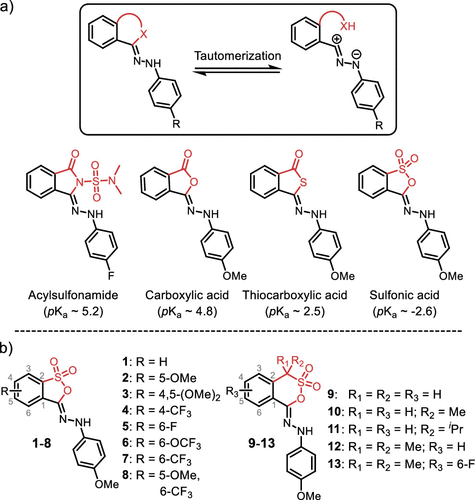 图1.(a) 根据共轭酸的pKa值选择合适的离去基团(红色标示),以促进环链的同构化。(b) 五元肼基磺酸盐(1-8)和六元肼基磺酸盐(9-13)的结构。