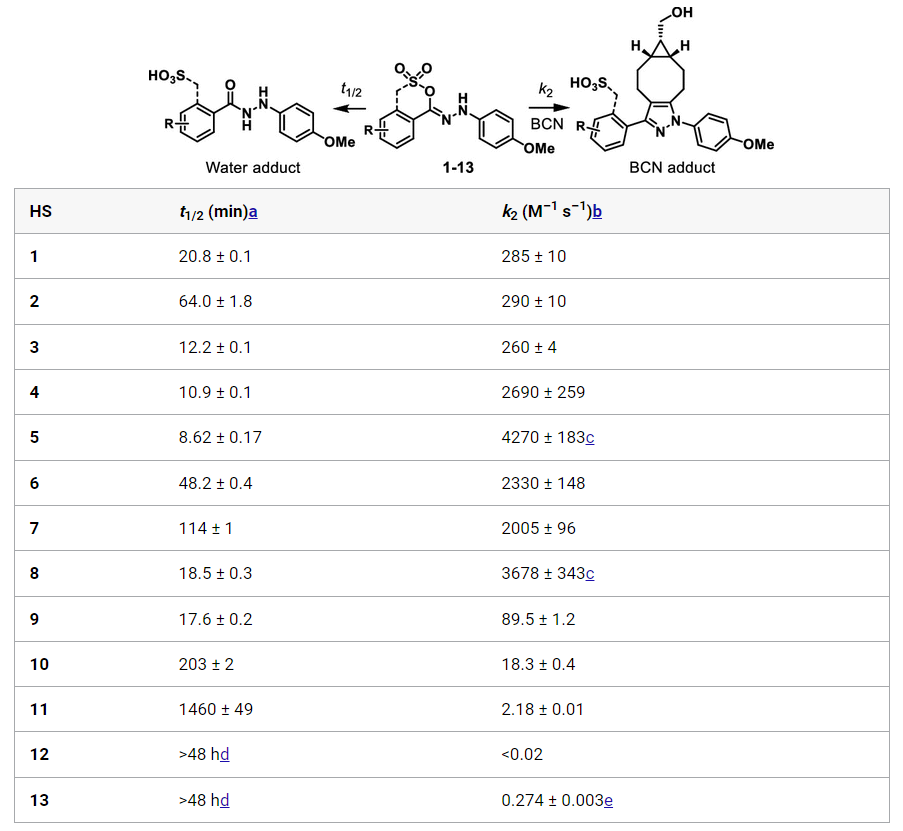 表1. 肼基磺酸盐1-13的稳定性及其与BCN的环加成反应的反应性