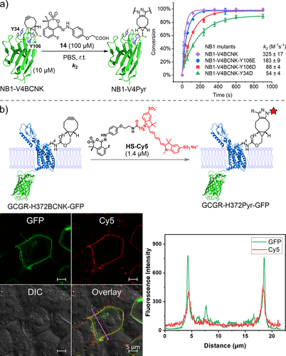 图3.(a) 通过HS-BCN反应对BCNK编码的纳米抗体进行生物正交修饰。。(b) 通过HS-BCN反应对活细胞中的GCGR进行生物正交荧光标记。上图:标记方案。左下图:在含有1.4μM HS-Cy5的DMEM培养基中培养1小时后,表达GCGR-H372BCNK-GFP的HEK 293T细胞的共聚焦显微照片。右下图:左边的重叠图像的线型分析。