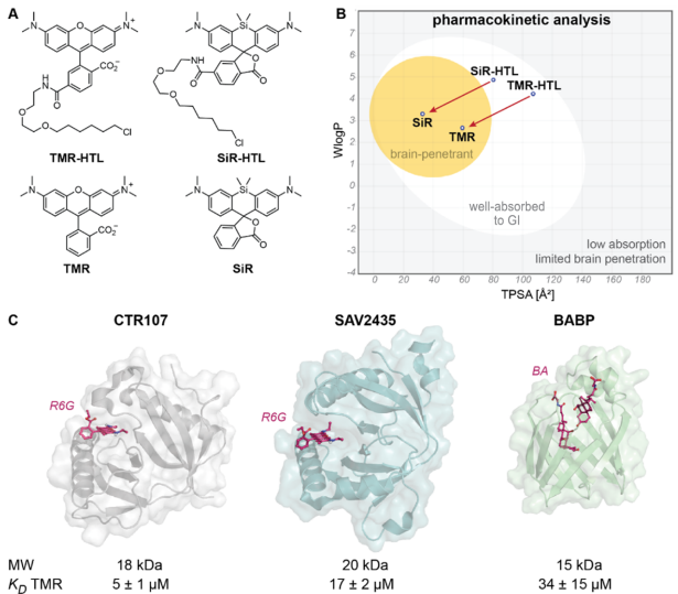 研究团队的突破始于一个关键洞察:未经修饰的罗丹明染料具有卓越的细胞膜穿透能力。通过瑞士ADME工具的模拟分析,他们发现未取代的四甲基罗丹明(TMR)和硅罗丹明(SiR)能够轻松穿越血脑屏障,而其HaloTag配体衍生物则被预测为脑部穿透性差。