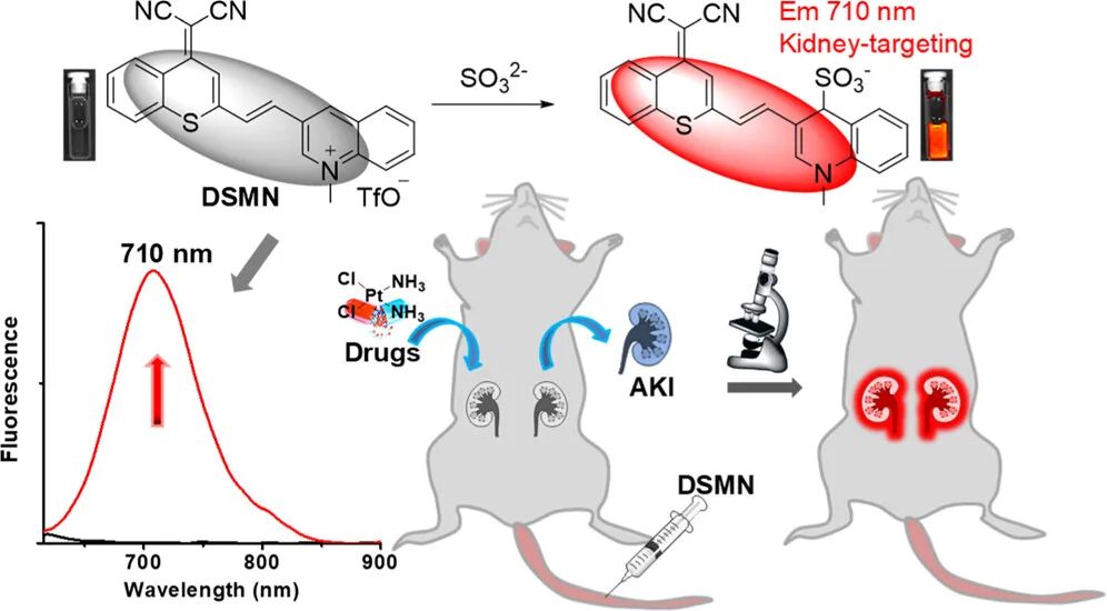 研究人员报道了一款高度敏感的近红外荧光探针DSMN,并以此首次揭示了SO2与药物诱导的AKI之间的关联。该探针对SO32-/HSO3-具有选择性的迅速响应,同时具备较大的斯托克斯位移(125 nm)。借助这些独特特性,该探针成功地应用于活细胞和小鼠体内SO2的检测。更为重要的是,该探针能够有选择性地定位于肾脏,从而监测肾脏中二氧化硫浓度的变化。基于这一特性,DSMN还成功用于检测顺铂诱导的AKI,研究结果表明,二氧化硫是药物诱导的AKI的新生物标志物,而DSMN则是研究和诊断此类疾病的有力工具。