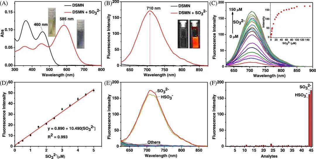 图1.(A) 加入 Na2SO3(100 μM)后 DSMN(10 μM)的吸收光谱和颜色变化。(B) 加入 Na2SO3(100 μM)后 DSMN(10 μM)的荧光光谱和发射颜色变化。(C) 加入不同浓度的 Na2SO3(0-150 μM)后 DSMN(10 μM)的荧光光谱变化。插入 710 纳米波长处的荧光饱和曲线。(D) 710 纳米波长处的荧光强度与 0 至 5 μM 的SO32- 浓度的线性关系。(E) DSMN 在 710 纳米波长处对各种分析物(除 GSH 外,每种分析物的浓度均为 100 μM)的荧光光谱和 (F) 强度变化。