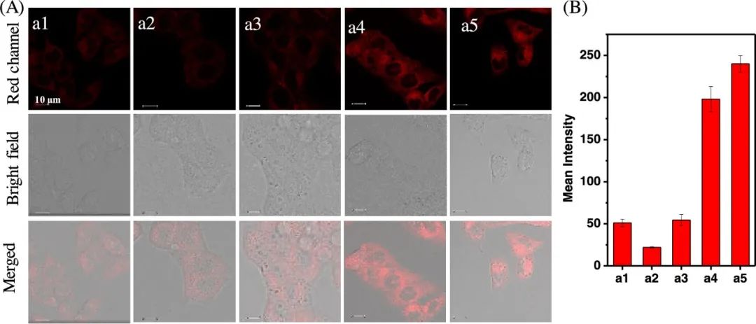 图2. (A) 染色 DSMN(10 μM)的细胞图像。细胞(a1) 仅用 DSMN 染色 0.5 小时;(a2) 与 FA(200 μM)孵育 30 分钟,然后用 DSMN 染色 0.5 小时;(a3) 与 FA(200 μM)孵育 30 分钟,然后与 GSH(500 μM)和 Na2S2O3(250 μM)孵育 0.5 h,然后用 DSMN 染色 0.5 h;(a4 和 a5)分别用 60 和 90 μM Na2SO3 孵育 0.5 h,然后用 DSMN 染色 0.5 h。(B) 图像(a1-a5)的荧光定量。红色通道:λex/λem = 633/(670-750) nm。