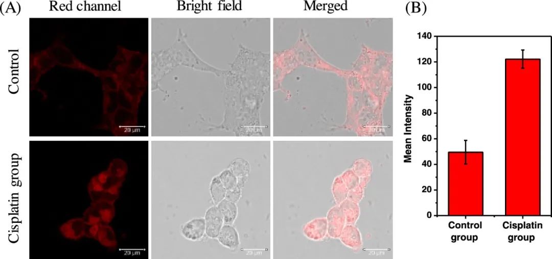 图3. (A) HEK293t 细胞图像。对照组:细胞仅用 DSMN(10 μM)染色 0.5 小时。顺铂组:细胞先用顺铂(1 mM)处理 8 小时,然后用 DSMN(10 μM)染色 30 分钟。(B) 图像荧光定量。红色通道:λex/λem = 633/(670-750) nm。