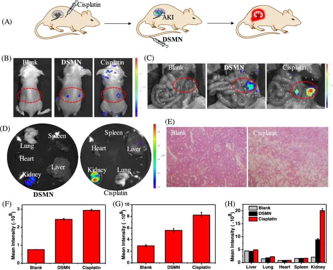 图4. (A) DSMN 用于检测顺铂诱导的 AKI 的图解。(B)小鼠原位和(C)腹部解剖后的荧光图像。空白组:小鼠静脉注射清水。顺铂组:小鼠腹腔注射顺铂(20 毫克/千克)48 小时,然后静脉注射 DSMN 0.5 小时。(D)(C)中 DSMN 组和顺铂组的离体器官图像。(E) 肾脏组织的 H&E 染色。(F,G)(B)和(C)的荧光强度。(H)(D)中器官的荧光强度与空白小鼠器官的荧光强度比较。误差条代表标准偏差(±S.D.),n = 3。λex = 580 nm,λem = 710 nm。