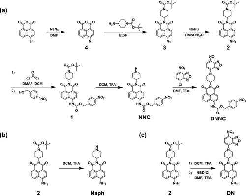 DNNC探针的设计基于萘二甲酰亚胺荧光团,通过分子间电荷转移(ICT)机制在547纳米波长处发出强烈荧光。该探针引入了对硝基还原酶(NTR)敏感的氨基甲酸硝基苄酯(NC)基团和对硫化氢(H2S)敏感的硝基苯并噁二唑(NBD)基团。这两个基团分别通过削弱ICT和光诱导电子转移(PET)机制来淬灭荧光。只有在H2S和NTR同时存在时,DNNC才会解离生成具有强荧光的中间体NNC和DN,最终转化为荧光团Naph。